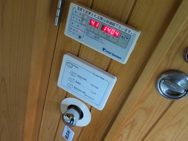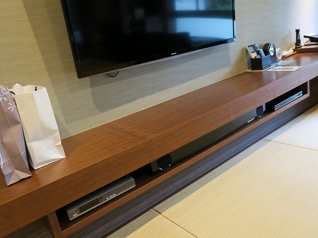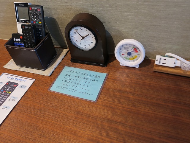 丸机の前には大型のテレビが壁に掛けられています。しかも音響システム等も綺麗に収納されています。リモコンでの操作が大変ですがテレビを見るぐらいなら簡単に操作できました。リモコンの近くには時計や湿度計そして電話機があります。時計はベッドの近くでも良いのではとも思いましたが・・・
