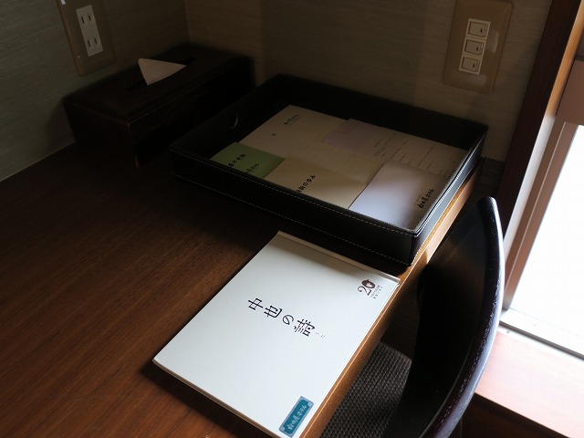 左側の壁には狭いながら書斎になっています。小さな椅子とコンセントそしてホテル案内があります。