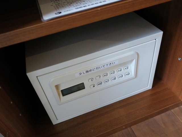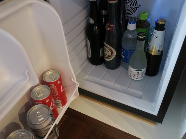 リビングの右側にはミニバーがあります。下の冷蔵庫の中身は可もなく不可もなくありきたりな内容です。その隣のセキュリティボックスは古めのデザインですが機能としては十分です。棚の上には急須やケルトなどが十分なほどに並んでいます。