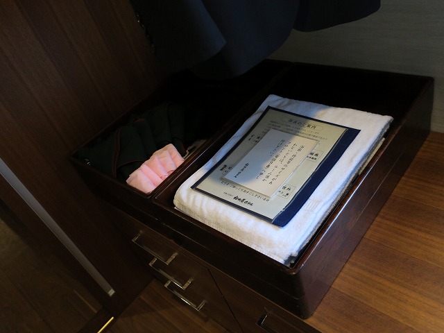 部屋の一番奥にはクローゼットがあります。浴衣等もこちらに準備されています。私は前回の宿泊で浴衣だけでなくパジャマがあることを知っていたので、ほぼ手ぶらで泊まりに来ましたがこれで正解です。