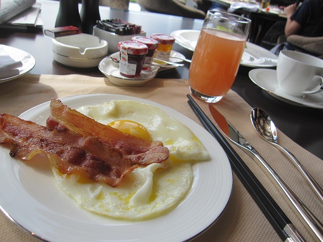 朝食のビュッフェは最高のディスプレイで準備されています。この並びは流石と思えました。卵とベーコンそしてオレンジジュースと紅茶はスタッフが持って来てくれます。味は普通ですが(笑)