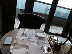 昨晩とは違い、朝なので明るい雰囲気で朝食を頂きます。今回は窓側の座席を準備頂きます。昨晩は気が付きませんでしたが、座っても香港の景色が見れるように外壁がガラスになっています。なるほど・・やはり細かい点に気が遣われていますね。