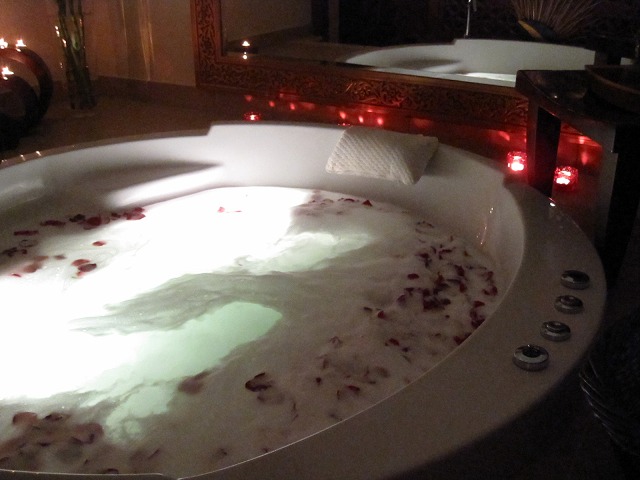 本当はヒマラヤンバスがあると一番いいのですが、今回はジェットバスでした。花弁一杯のロマンテックなお風呂を20分ほど堪能したところで、ベルを鳴らして終了です。
