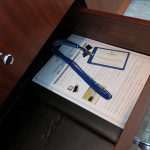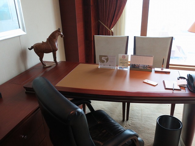 部屋の左奥が書斎机になっています。私が座る椅子は更に豪華で革張りです。向かいの机やサインするためのペンなどは流石です。今回の宿泊の目的を伝えてあったのは更に良かったようです。逆に机の上には無駄な物が一切ありませんでした。シンプルで私の好きなスタイルです。