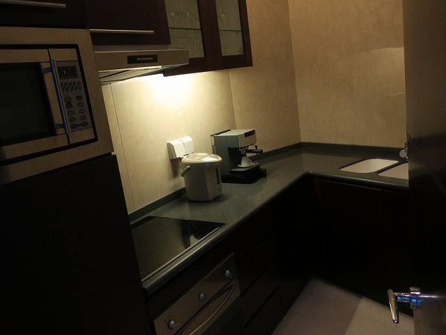 リビングとベッドルームの間にはバトラー用の裏口があります。裏口の真正面にはキッチンがあります。大きくて総ての調理器具が揃っているので、私がお願いしておいた無理難題をレストラン側で作り最後の処理をココでバトラーの方々が実施されておりました。何も無いと無駄に広いのですが会食の時にはこれでも狭いぐらいに活用されていました。