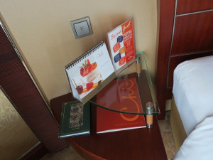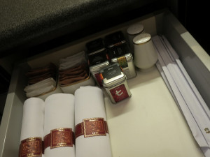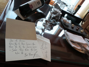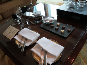 机の上にはウェルカムの品々が並んでいます。ケーキにチョコレートにワインそしてお葉のセットです。お茶のセットはバトラーにお願いすると20分ほどで入れて頂けました。茶葉も色々あるようで好みを言ってくれと言われました・・しかし私には中国の茶葉は分からないので友人にお願いして選定です。