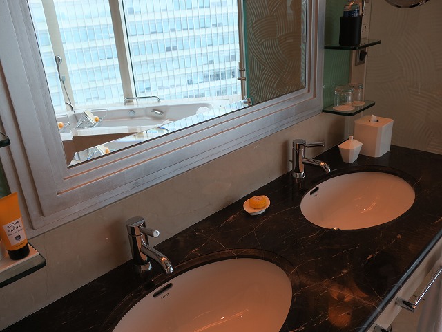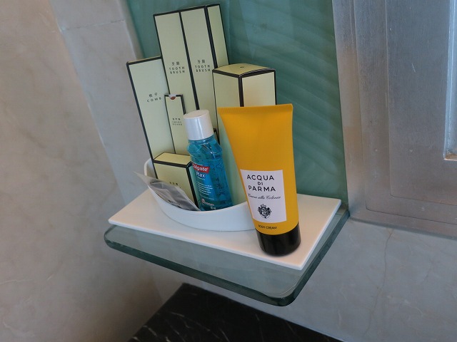 シンクもダブルで広々と使えます。準備されているアメニティもACQUA DI PARMAです。シャングリラと言えばロクシタンのイメージなんですが之も良いですね。