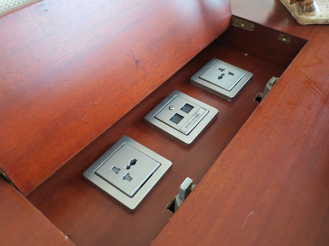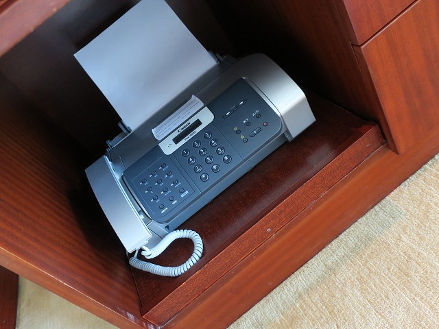 袖机には文具やFAX兼コピー機があります。コピーは仕事ではとても有難いのでこの部屋で助かりました。いちいちビジネスセンターに行くよりはそのままポチっと処理できたほうが幸せですよね。電源も200Vではありますが日本で使っているプラグがそのまま使えます。