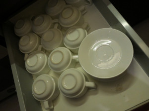 私が個人的に使ったのは一杯の冷蔵庫とエスプレッソマシーンぐらいですが、オーブンレンジや流しにコンロも備えており、中には無数の食器類が揃えられています。