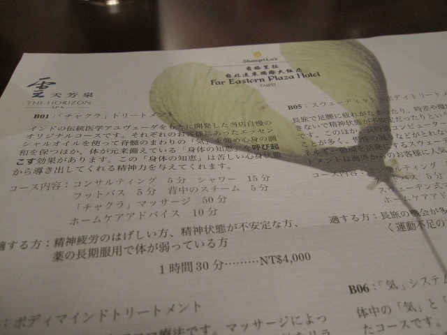 シャングリ・ラ ホテルのSPAと言えば「氣」ですが、シャングリ・ラ ファーイースタンプラザ ホテルは残念がら違います。その名も「The Horizon SPA」です。メニューを見ると只のヘルスクラブのマッサージでは無さそうな雰囲気ですが・・さて結果は?