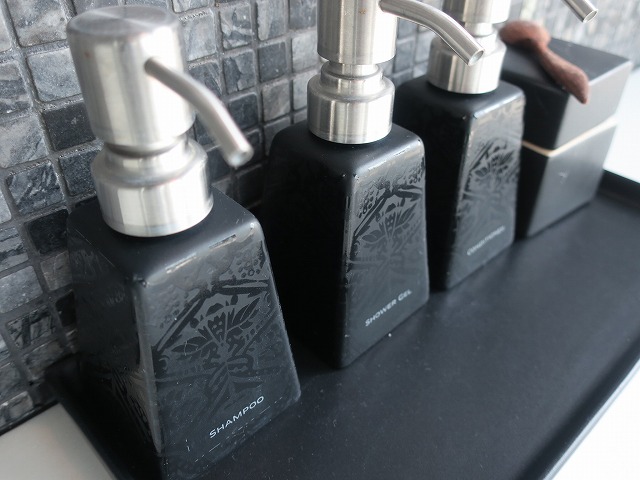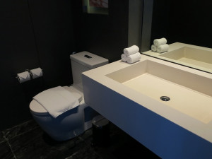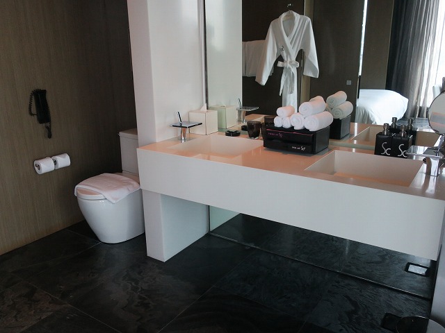 ベッドルームから大きな境目は無くダブルのシンクにトイレが見えます。部屋を大きく使う最近のデザインは解放感があります。歯ブラシなどは「HERS」と「HIS」と何時もと同じく分離されています。