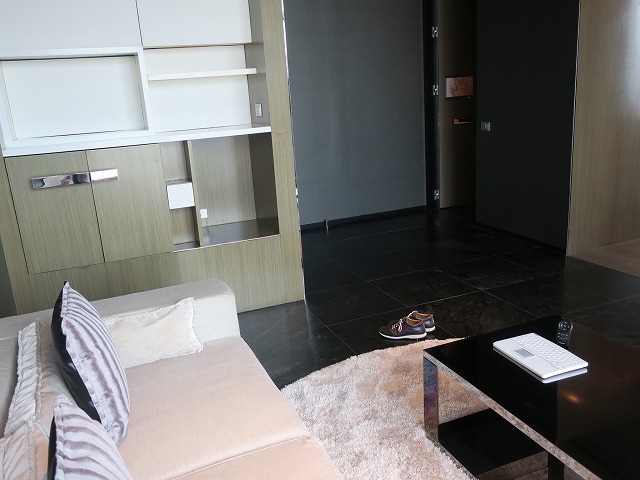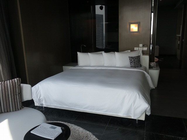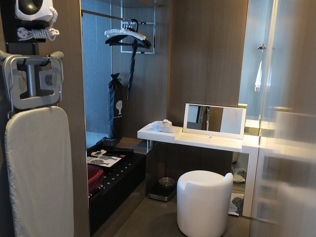 ベッドルームへの移動する通路にはクローゼットが配置されています。スーツケースを置く場所、セキュリティボックス、体重計、アイロン台も準備されています。もちろん服も十分に収納できるだけの広さがあります。そして化粧台もココに置かれています、意外と中は明るいのですが、ベッドルーム側との壁がガラスになっており光を通しているのですね。これも良い発想です!