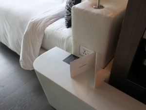 角の部屋なのでリビングだけでなくベッドルームも窓に囲まれています。ベッドは白いイメージで作られています。枕の並べ方も良いです。ベッドサイドには電源のアウトレットもデザイン良く並べられています。だからSOソフィテルが好きなんですね!