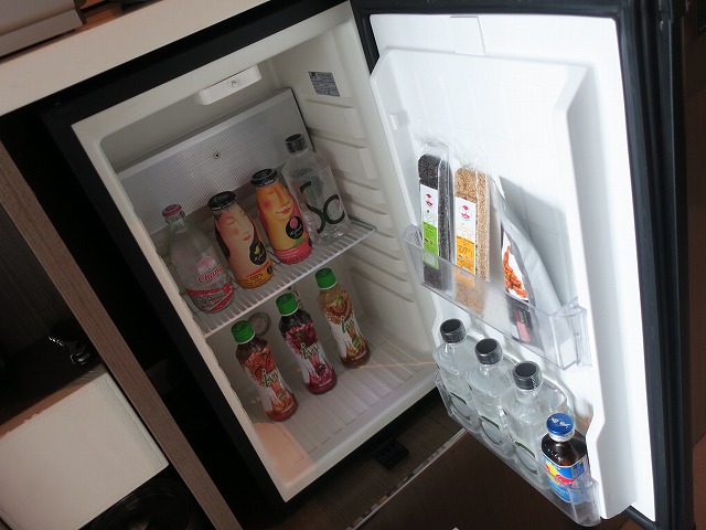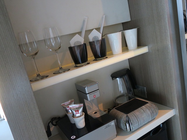 ベッドルームの入り口にはミニバーですiLLYのコーヒーメーカやグラス類が綺麗に配置されています。下の冷蔵庫の中も流石のセットアップですね!