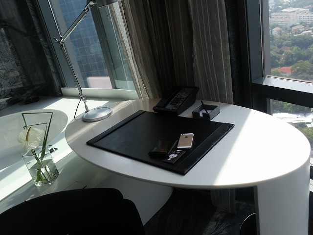 部屋の角には書斎があります。机も少し丸みを帯びておりシンプルに作られています。文具も少しだけおいてあります。最低限と言ったところでしょうか。横を見るとバスタブがガラス越しに見える斬新なデザインです。これも有りですね!電源アウトレット等も隣に埋め込まれています。