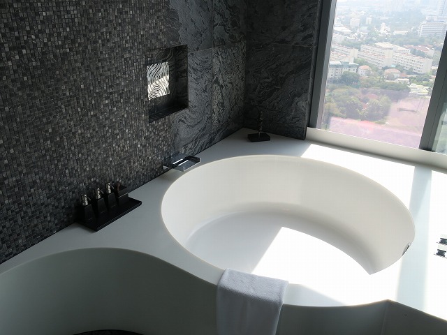 角のバスタブが大きく丸く白く眩しく感じられます。SOソフィテルはバスタブに毎回拘りがあります。同時に壁の造りも成程です!