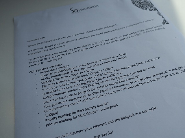 今回はSOソフィテルの担当の方と直接連絡を行っての予約です。慣れてくると車の手配も含めてメール一本で簡単に話が通る担当者との予約も有りですね。初めての場所だとAMEXの協力があると良いのですが、今回は慣れた場所なので直接依頼します。