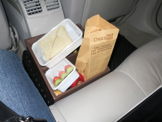 朝5時にはホテルを出発してホテルの車で空港に向かいます。こんな時は朝ご飯を車にセットアップして頂きます。大したものではありませんあ車の中でサンドイッチを食べてフルーツを食べて準電完了です!