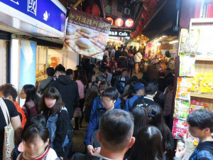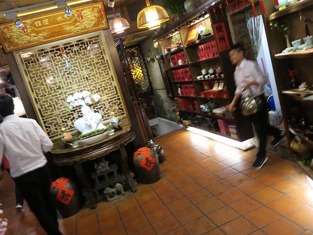 私のイメージでは直線距離で200m程度なので入口から10分程度で阿妹茶の景色の場所に着くと軽く考えていました。中に入ると左右にはお土産屋さんと屋台です。そして渋滞状態で歩いて前に進むこともできない状態です。更に天井が常にあるわけではないので、時折雨、時折傘のような不便な状態です。そして・・・一本道ではありません。幾つも路地を選んで進む必要があります。何度も何度も間違えて進みます。