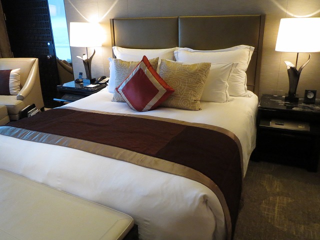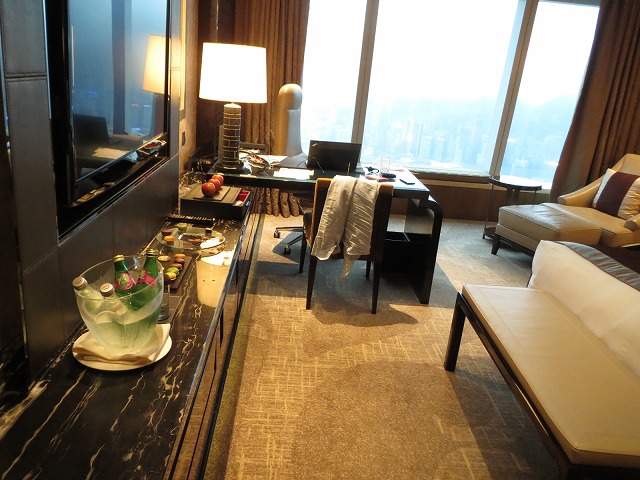 部屋からの景色を見回すと香港島が見えています。更に話を聞くと自然と部屋がハーバー アイランド ルームにアップグレードされていました。何も言わないから分かりませんでしたが自然とアップグレードされていました。またAMEXからの予約なので朝食、数百ドルの利用券等が付いていました。更に部屋にあるスナック類が何時もと変わりません。もう何がアップグレードで何がAMEXの特典で何が普通なのか私には分からなくなりました。ただ一言言えるのが「素晴らしい」だけです。