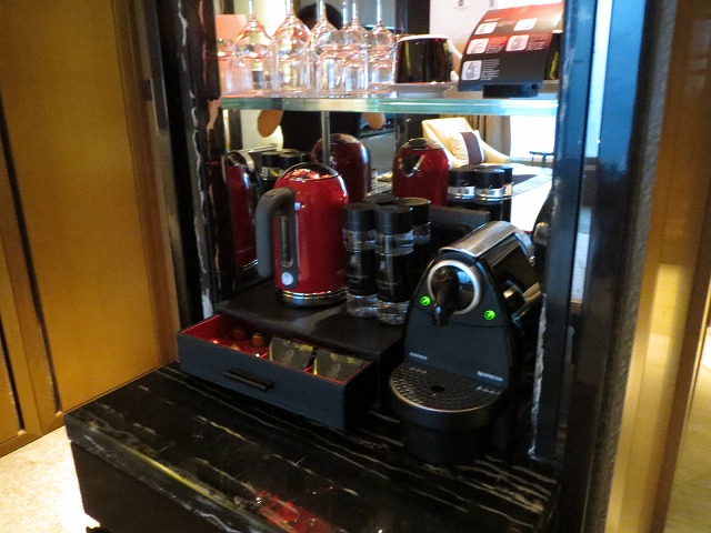 ベッドの左にはミニバーがあります。こちらにはエスプレッソマシーンにコップそして下には冷蔵庫です。冷蔵庫には簡単なアルコールと水やソフトドリンクがあります。通常は先ほど頂いた水だけで十分ですが、疲れたときにはこの中からフルーツのジュースを頂きます。これがまた美味いのです!