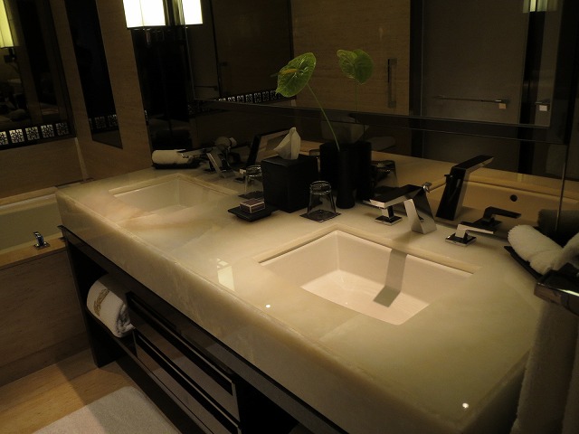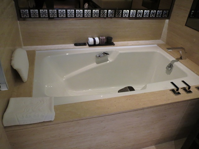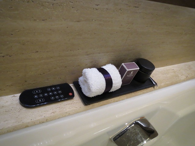 バスタブは深さも湯量も十分な仕様です。準備されているアメニティも私が好きな設定です。私はバスソルトを入れて30分ほど温いお湯に浸かって就寝です。自分の家で自分のために30分もお風呂に入る事はありませんが・・・お風呂に入りながら目の前には小さなテレビがあります。このテレビを見ながらのんびりですね。今回はこのリモコンの電池が切れているようで使えませんでした。でも心配はいりません、リビングのリモコンを使えば操作する事ができます。流石のRitz Carltonも全てにおいて完璧ではないということですね(笑)多分GROが素晴らしいので一つや二つの問題は逆に親しみに感じるのは不思議です。