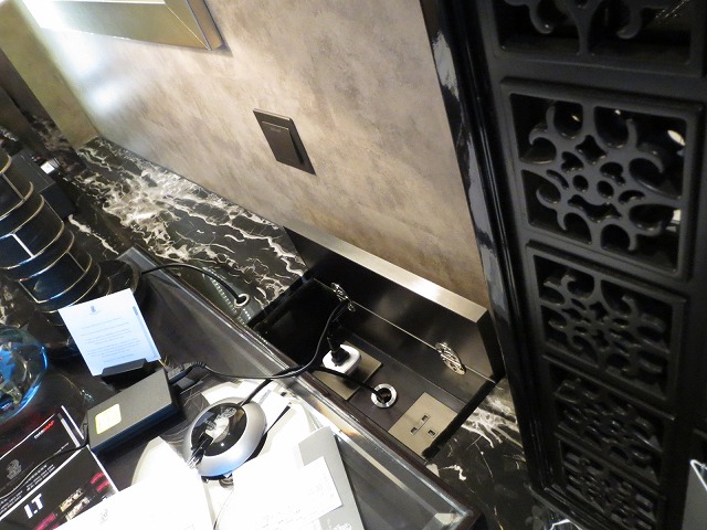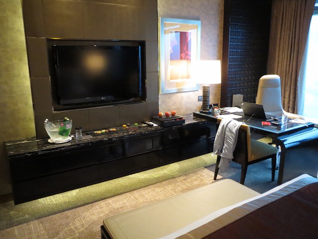 窓際には机が設置されておりこれもデザインが効いています。上からのライトや電源等はとても良く考えられています。椅子は慣れるまで少し時間がかかります。リクライニングの角度を自分好みに持って行くのが大変です。若干、携帯電話が入りにくいので電話は固定電話を使って話をすることが多いのですが、ハンドフリーで話をしても問題はありません。もちろんWIFIも強く快適に入るので便利です。ラウンジなどは少し弱い(混雑している??)のですが部屋はとても快適です。かなり予定がずれたのでパソコンでテレビ会議、同時に電話でほか外にいるメンバーも話に入り、iPhoneで予定を確認すると言った通常のオフィスよりも仕事をする事に今回はなりました。