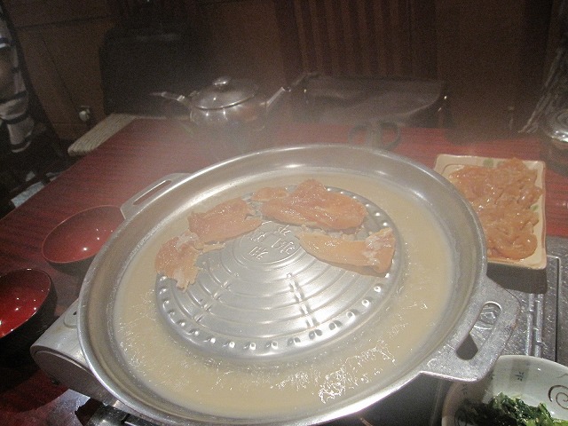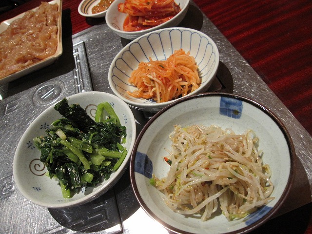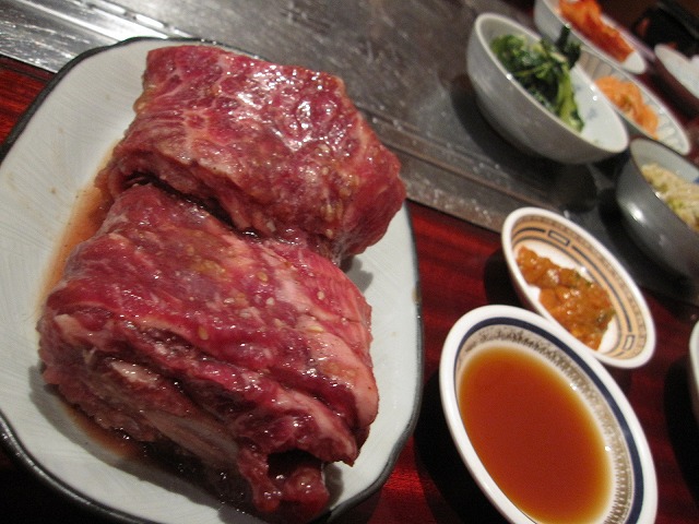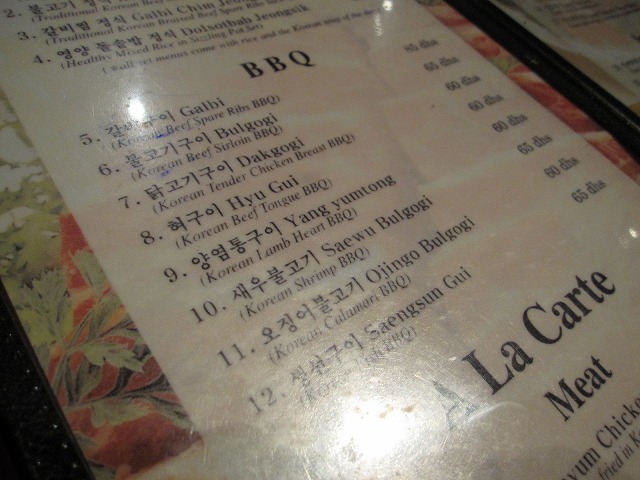 見かけは日本っぽく作ってあるのですが、入って行くと完全に韓国料理店です。多くの韓国の人が良い気分で酔っぱらっています。実は午前中に一度訪れてメニューと店の場所は確認し予約してあったので大体の目星はついていたのですが、確認しやはりBBQが焼肉であろうとの結論になりオーダーします。