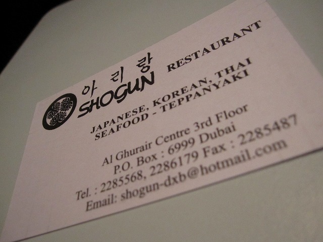 メトロのユニオン スクエアを降り少し歩いたAl Ghurair Centerの三階に位置します。入口は少し分かりずらいですがチリーズの隣の入り口を入って行けば看板が出ています。看板にはSHOGUN、上にはアラビア語とハングルと言う奇妙な看板もドバイで見ると全然変ではないのは慣れの問題ですかね・・・