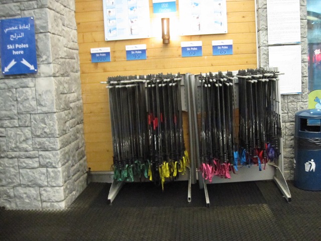 服を着替えて準備万端にしてスロープに向かいます。ここで滑れる人はメインスロープに向かいます。最後のエスカレータを上った場所にストックがあるので自由に持って行っても構いませんでした。