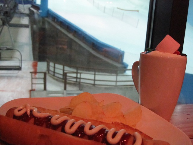 5本滑ったところで寒くて寒くてギブアップです。中間駅にあるカフェでホットチョコとホットドッグを食べて暫く休憩です。このカフェが入っているロッジがまた渋い・・本当に木でできているようです。何回も書きますが、外は40度、中は-10度、そこでヒーターを付けて温めているスキードバイとは・・・すごいですね・・・